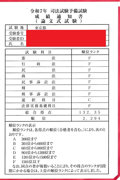 法律の勉強始めて1年10ヶ月ぐらいで受験してきた、2025年の予備試験論文の成績表が来たので発表します!